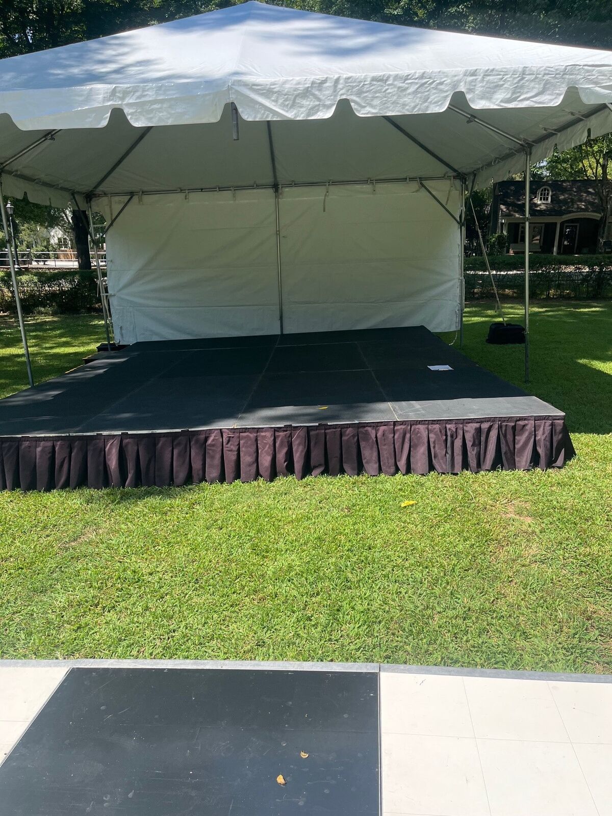 This stage is comfortable for a 5-8 pc band. It requires 10 4′ x 8′ Stage sections. Surface is textured, non-slip painted black. Shown with optional 16″ high black skirting. Setting up stages outdoors requires that they be leveled (additional charge) and may need to be tented. Normal set up (flat ground) is included in the rental price. All stages must be delivered and set up. Delivery is additional based on where they are delivered