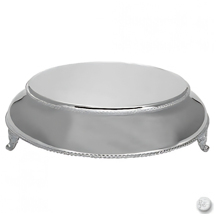 19″ diameter silver plated cake plateau. Lifts cake 4 3/4″ off the table top