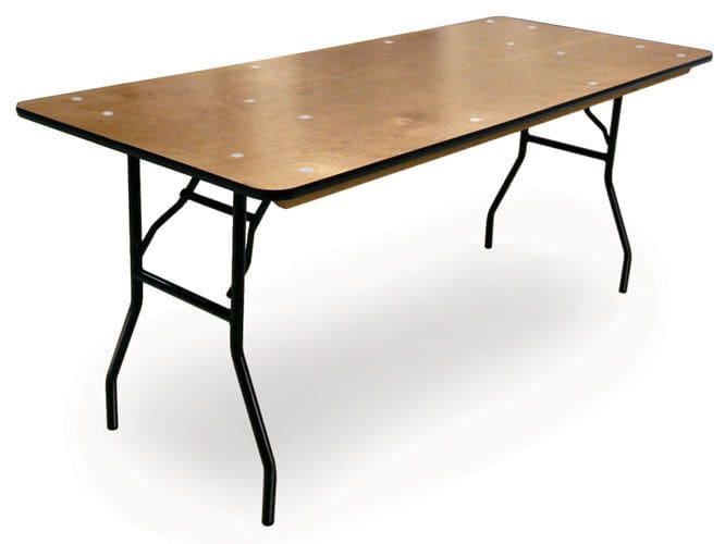 8′ x 30″ Table with folding legs. Plywood or aluminum Seats. 4 down each side and 1 on each end for a maximum of 10. Also used for buffet tables. Use 60″x 120 ” cloth to cover the top and drop 12-15″ on the sides. Use 90″x 156″ cloth to cover to the floor