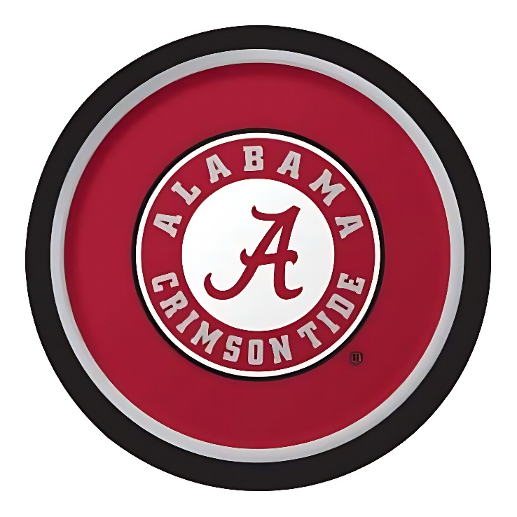 8 lunch size plates with the licensed Alabama Crimson Tide logo. Heavy gauge paper. Coordinating colors are red, black, white