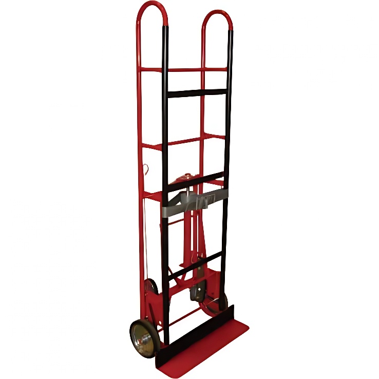 Has a wrap around belt that tightens to help tilt back your load. Also has V-belts that facilitate moving loads up and down stairs.