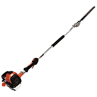 A gas powered hedge trimmer mounted on a pole for those hard to reach places. The head of the unit also adjusts angles. This makes it easy to box off the top of those tall bushes out of normal reach.