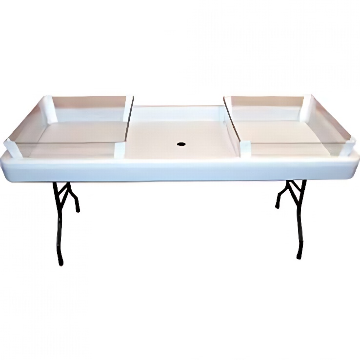 Shown with optional Extensions and insert. This table is the answer for keeping anything cold while serving it in style. It has fitting underneath for a drain hose. Optional skirting available. Color: Black Size: 6′ long X 30″ wide.