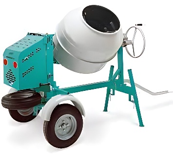 Towable 9 cubic foot gas mixer for concrete, mortar, stucco, and grout. Will hold 3 standard bags of quikcrete to make 9 cu feet. Towable unit with 2″ ball and runs on a Honda 4 cycle motor. Top bin rotates for easy pouring and extendable legs for support once you get to job site. Must be cleaned out before concrete has hardened to avoid cleanup fee .